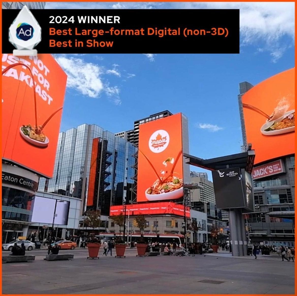 Nous sommes fiers de notre participation au OOH Day 2024 de l’AdClub Toronto, où notre campagne « Maple Goes With Everything » pour Maple from Canada a remporté deux prix prestigieux : Large Format Non-3D et le Best In-Show, la plus haute distinction de la soirée. Cette reconnaissance est le fruit d’une collaboration exceptionnelle entre nos équipes et nos partenaires, dont Rethink, Rodeo FX, et Branded Cities, ainsi que la confiance et l’appui de notre client, Les Producteurs et productrices acéricoles du Québec (PPAQ).